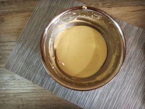 加入蛋液,用打蛋器打至与奶酪完全混和后筛入玉米淀粉,用刮刀翻拌均匀无颗粒。