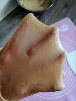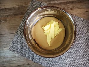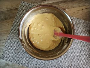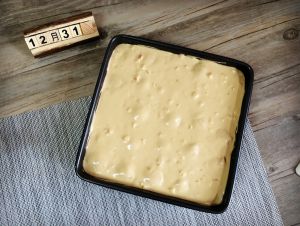 倒入事先备好的苹果乳酪馅,稍震一下模(不要过度过重,以免发好的面团泄气),然后表面抹平整。