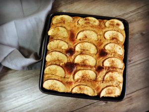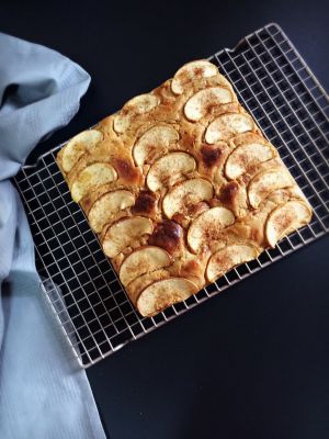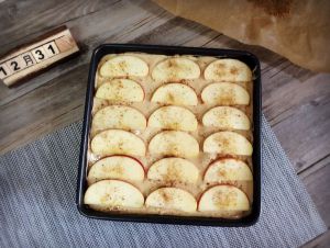 铺好苹果片,撒上红糖肉桂粉(红糖和肉桂粉事先拌匀),烤箱180度预热。