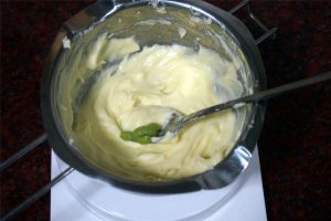加入芥末(喜欢辣的可以加多点),搅拌均匀,成为芥末芝士酱,装入裱花袋。