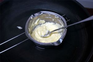 将奶油芝士,盐,细砂糖,纯牛奶隔水融化搅拌均匀。