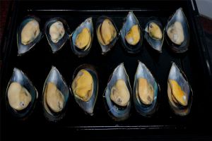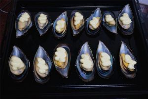 将调好的酱料挤到青口上,然后放入烤箱中层220度上下火烘烤10~12分钟即可。