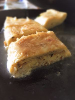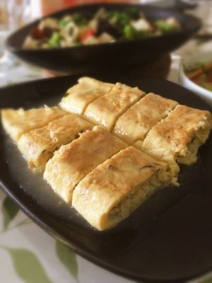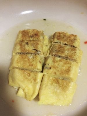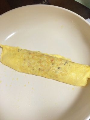 卷好后两面再稍微煎一下,取出,切厚段。此时蛋卷中间未完全熟透。