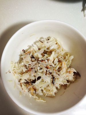 蟹,清洗,翻开腹脐捏少许盐,隔水蒸熟,取肉,稍微撕一下,不用太碎。