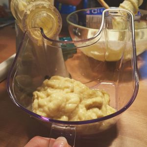 如果喜歡有果肉口感的就將榴蓮碾壓成泥,如果喜歡細膩口感的就用榨汁機將榴蓮榨碎。