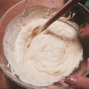 將淡奶反復打至膨化,期間加入適量糖使其微出甜味即可,最後倒入榴蓮泥,攪拌均勻。