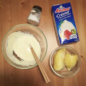準備食材:榴蓮(2塊),淡奶油(兩個雪條的量),糖(適量),工具:最好使用打蛋器,否則就用筷子也行,當做減手臂贅肉。。。
