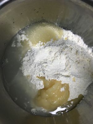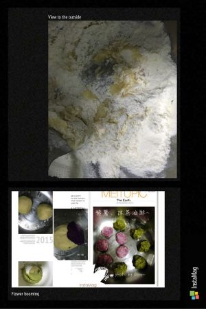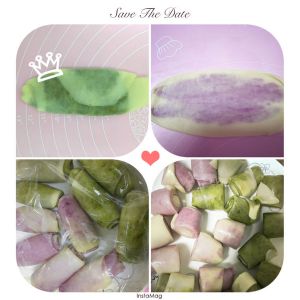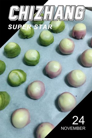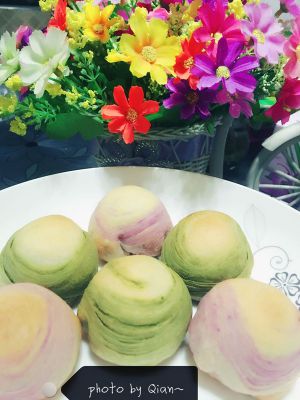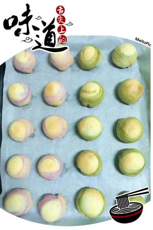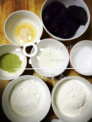 酥油皮:低筋面粉,猪油50g的,混合分成2等份,分别加入4g的抹茶粉和10g的紫薯泥,各分成5份。