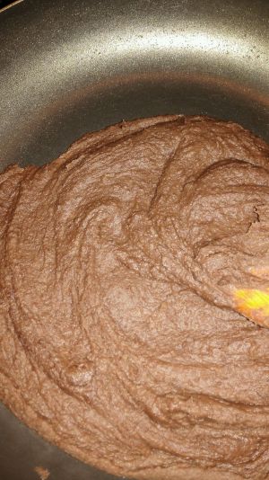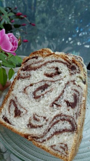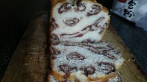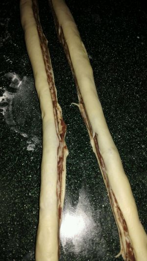 将面团分为平均的两份,取一个面团擀成长方形面皮,再面皮上涂上豆沙,靠近边边上不涂