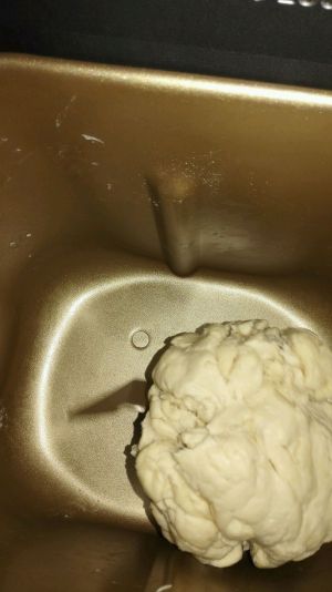 将淡奶油,黄油,牛奶酵母水,蛋白液加入面包机搅拌桶混合,再加入高粉和糖,开启一个和面程序大概15分钟揉面揉到均匀就可以了,不需要揉到出膜,然后盖上保鲜膜放里面发酵