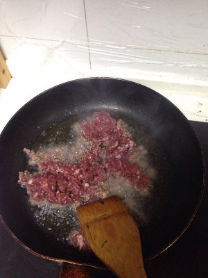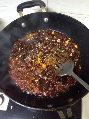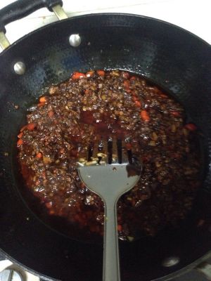 香菇炒干水分放入辣椒,豆瓣酱,豆豉,(也可以加入一些甜面酱)