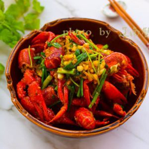 把炒过的小龙虾推到锅边,下入大部分蒜碎和葱姜碎,炒香。