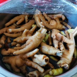 鸡爪水开烫两滚,不能太烂,用手指掐一下,起锅放如冷水中冲泡捞起