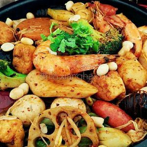 起锅烧油,倒入葱姜蒜炒香,再倒入辣椒。花椒,八角,桂皮,香叶,翻炒出香味。倒入豆瓣酱炒出红油,加入火锅底料炒出香味。倒入全部菜翻炒,放白糖,鸡精。调味闷煮两分钟!