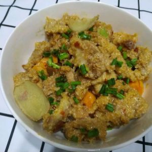 将腌好的肉铺在上面,放两片切成薄片的生姜在上面(或者在腌肉的时候加入姜粒一起腌,怕上火的可以像我这样最后加姜片),上锅蒸40分钟左右,用筷子往里插,能轻松插到底就是熟了