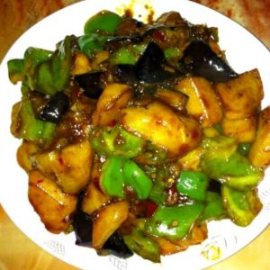 7倒入炸好的土豆,茄子,柿子椒翻炒均匀,少油版地三鲜即可出锅啦~