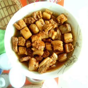加肉红烧酱油,捂盖10分钟,加入冰糖(比例是一斤肉一两糖),开盖中火收汁,收汁时要用汤勺不断浇汤汁到肉块上,这样肉更能入味。