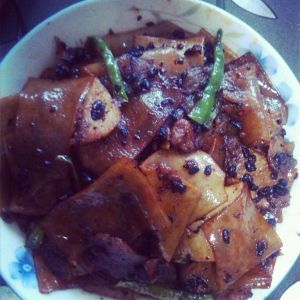 锅下油后,将五花肉放入不断翻炒,至肉变色后捞出,锅留少许油,下郫县豆瓣酱炒出红油,下豆豉,青椒,五花肉,绿豆粉皮不断翻炒,加白糖,鸡精后起锅
