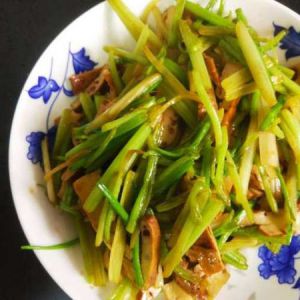 把香干也倒进去,继续翻炒,放盐少许,倒1点点美味鲜酱油,继续翻炒几下,然后加一点点水,炒至芹菜变软就差不多了