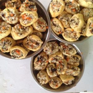 放油五花肉炒香、放入胡萝卜丁、木耳、香菇、芋头炒熟。