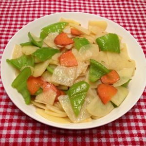 土豆去皮切片,用清水浸泡。尖椒切片,胡萝卜也切片。葱姜蒜切碎备用。