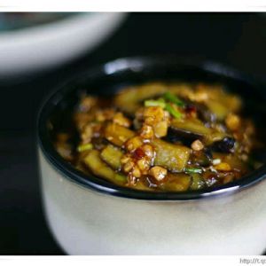 大火加热炒锅中的油,放入蒜蓉,青红椒碎,洋葱碎,海鲜酱和辣椒酱炒香。再调入花雕酒和高汤,下入处理过的猪肉馅和茄子条,再调入蚝油,盐,白胡椒粉,白砂糖和生抽。