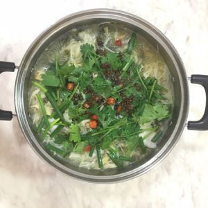 香菜末葱末在锅面,浇热油。很清淡的类似于清汤的酸菜鱼。