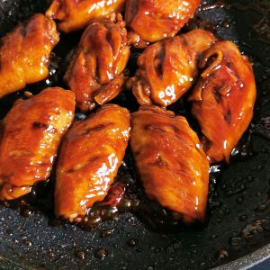 平底煎锅,放少许油,将淹制好的鸡翅凉油摆放锅闪,中火,鸡翅两面呈现焦黄色,倒入可乐,大火焖5分钟,关小火焖,汤汁呈浓稠状即可盛出。