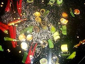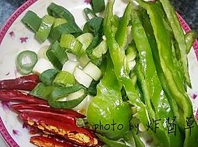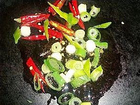 锅内倒油后放入红椒葱花,爆出香味加入老抽和水