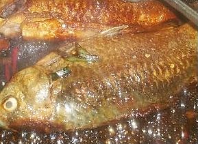 汤汁烧开后放入煎好的鱼,倒少许料洒白糖