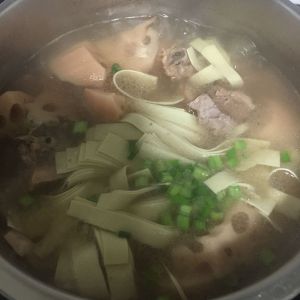 解气后打开,开大火放入千张煮熟,加入盐,葱花,起锅。香喷喷。男友喝了三大碗。