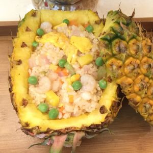 将米饭炒散,倒入菠萝和鸡蛋碎翻炒,加少许盐,糖,鸡精,两勺生抽调味。