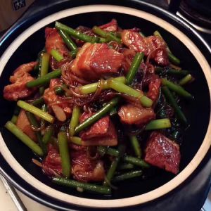 粉丝用温水泡软,锅里加入蒜薹炖一会,放少许盐,再加入粉丝,用旺火收汁,加一些鸡精调味。