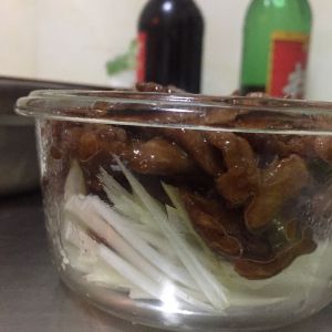 里脊肉切丝加淀粉和鸡蛋清,盐少许腌制一会。