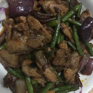 锅中放油,依次放入葱姜蒜蒜苔洋葱,豆瓣酱,酱油最后放入肉翻炒均匀即可出锅!