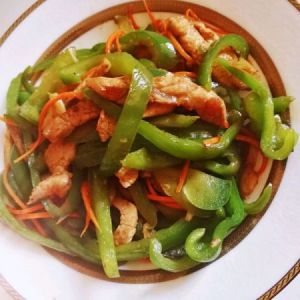 加入青椒胡萝卜丝翻炒 ,加盐,味精,酱油