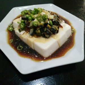 豆腐直接用刀切几下,皮蛋大蒜辣椒切粒放上去。