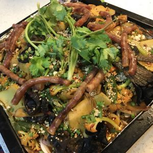 烤好拿出依次撒上葱、芝麻、花生碎、香菜。开吃