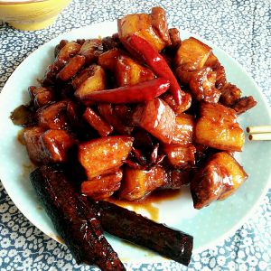 下油锅翻炒至变色,根据肉量多少,适当添加红烧汁。