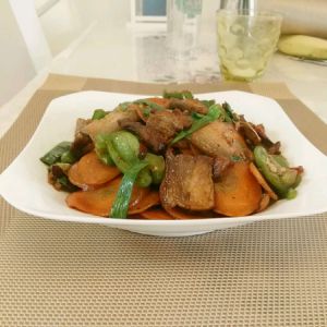 最后放青椒胡萝卜翻炒,加盐(注意豆瓣酱本身盐分就足够,少量加盐不然会很咸),出锅前放鸡精或者味精,我啥也没放,因为我们家都不爱吃味精