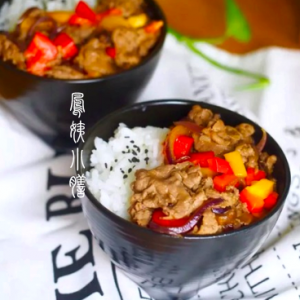 待彩椒炒至稍软,出锅,铺放在碗中煮好的米饭上,就可以吃啦!