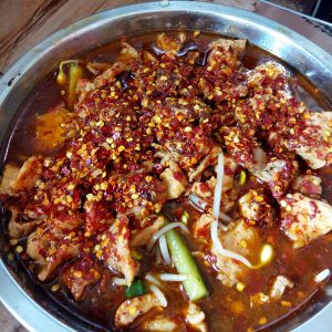 锅里放豆瓣酱将葱油炒一下,然后放水,水开了,然后再放肉煮熟,把肉放在豆芽上面,锅里放油,把油烧开了,然后粘在上面就可以了。