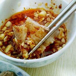 把肉夹出放到盘子里摆放好,把蒜弄成蒜末放到碗里,锅里放少许油加热,将加热好之后的油倒入盛放蒜末的碗里,并在碗里放入少许生抽、盐和鸡精还有辣椒油。