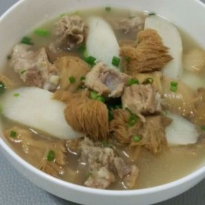 汤煲内倒入水,排骨,猴头菇,姜片,大火煮开,用汤勺将浮沫撇去。开小火慢煲一个小时左右。