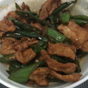 放油,把腌制好的肉爆炒,加适量的盐。爆炒完加入青椒,放入少量水炒熟,加入盐和鸡精即可装盘。