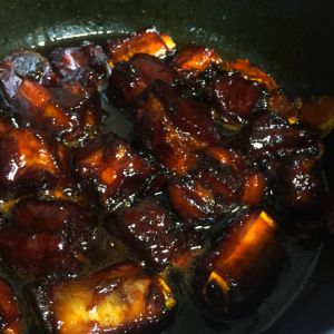 待着色完成后加热水至没过排骨,加入酱油,料酒,生姜,调小火候,盖锅盖炖煮收汁。
