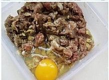 羊肉馅加盐、鸡蛋1个、料酒、葱末、姜末、花椒水,顺一个方向搅打上劲。