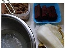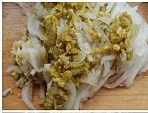 、酸菜用清水泡上一会,洗净,攥去水分,把酸菜片成薄片,再切成细丝,备用。