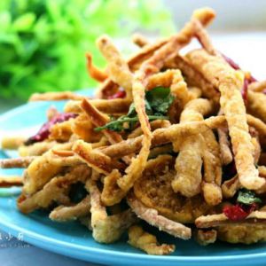 锅内烧油炸茶树菇,大概7成热下锅,火不要太急,不然容易炸糊~炸至酥脆金黄后就可以捞出哦~