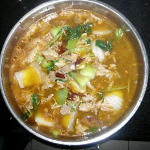锅里放适量油,将葱姜蒜依次放入炒香,将水煮肉片的料倒入炒香放适量水。水开后,将白菜,油菜,金针菇,放入。八分熟时,用筷子夹入容器中备用。在原汤中放入腌好的肉片。肉片煮熟后,倒入放菜的容器中。